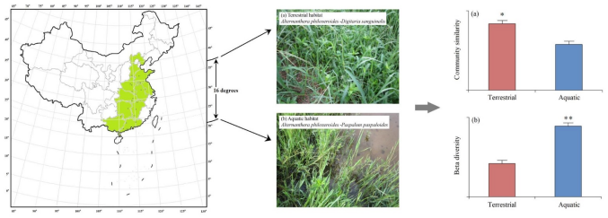 附图:水、陆两境中空心莲子草群落相似性及Beta多样性的纬向调查