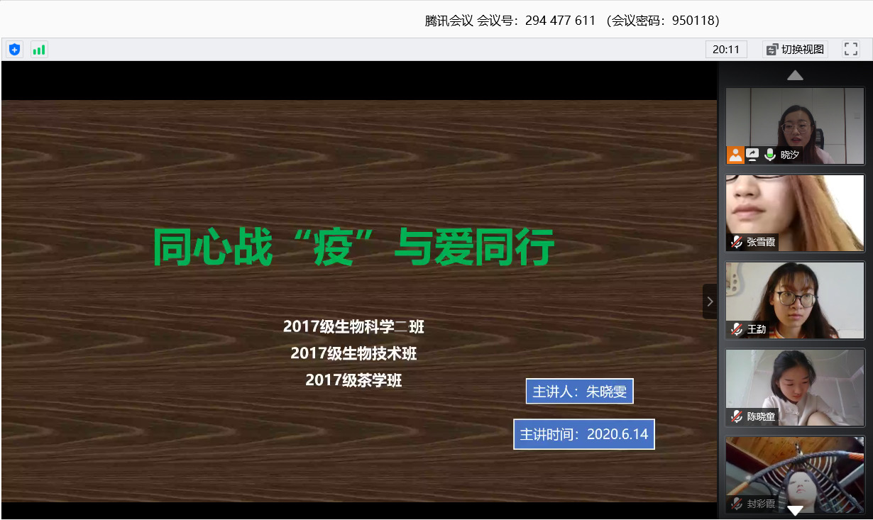 为弘扬爱国主义精神,加强疫情防控期间学子们的思想教育和价值引领,保障网上教学顺利进行,坚定学子们考研信念。6月14日下午,公司2017级生物科学二班、2017级生物技术班、2017级茶学班开展“同心战‘疫’,与爱同行”线上主题班会。班会由专职辅导员朱晓雯主持。