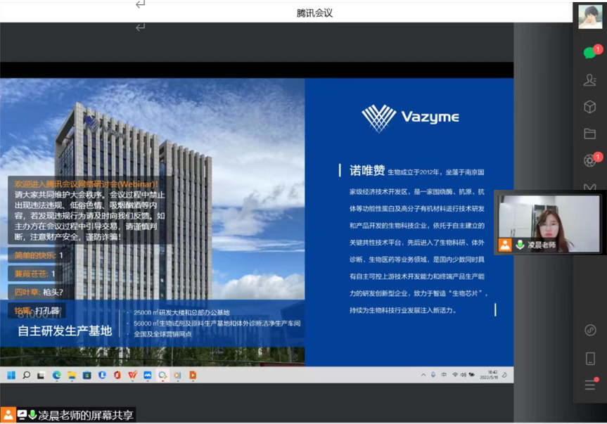 南京诺唯赞生物科技股份公司人事部经理凌晨招聘单位通过播放宣传片、PPT展示、线上连线交流的方式向同学们详细介绍公司的概况、软、硬件条件、发展历程、企业文化、核心技术等。南京诺唯赞生物科技股份公司成立于2012年3月,是一家围绕酶、抗原、抗体等功能性蛋白及高分子有机材料进行技术研发和产品开发的生物科技企业,依托于自主建立的关键共性技术平台,先后进入了生物试剂、体外诊断和生物医药业务领域,目前拥有六大技术平台:酶定向进化平台、缓冲化学筛选平台、化学合成平台、高密度发酵平台、蛋白性质分析平台、信息分析平台,同时具有自主可控上游技术开发能力和终端产品生产能力的研发创新型企业的研发团队具有雄厚的研发实力,硕士及以上学历人员占比50%以上。随后凌晨对大家关心的招聘岗位、工作职责、任职要求、薪资待遇等方面内容进行了答疑,并与公司员工互留了联系方式。