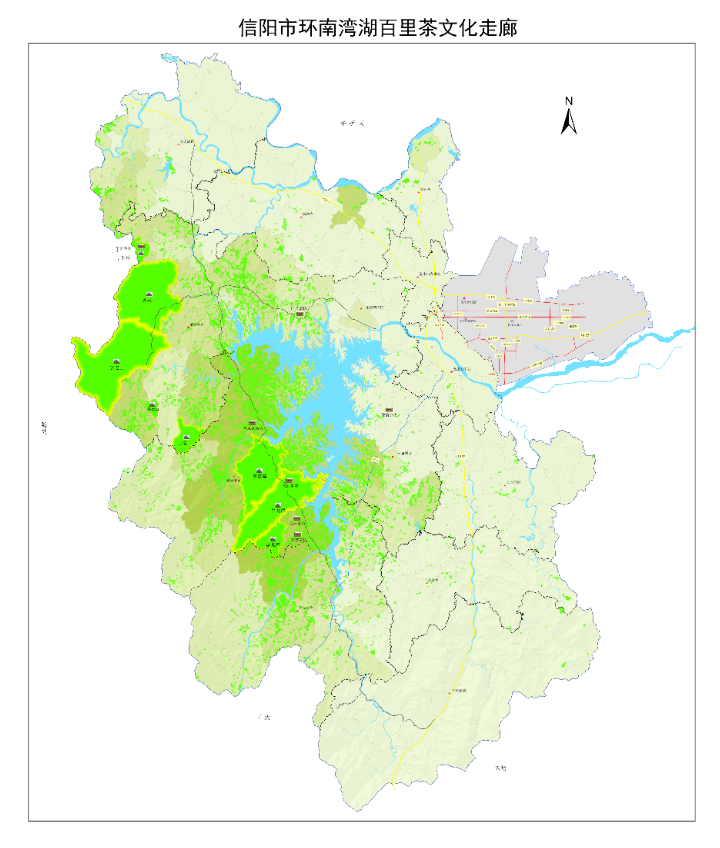 以信阳师范公司为起点的“信阳市环南湾湖百里茶文化走廊”地图