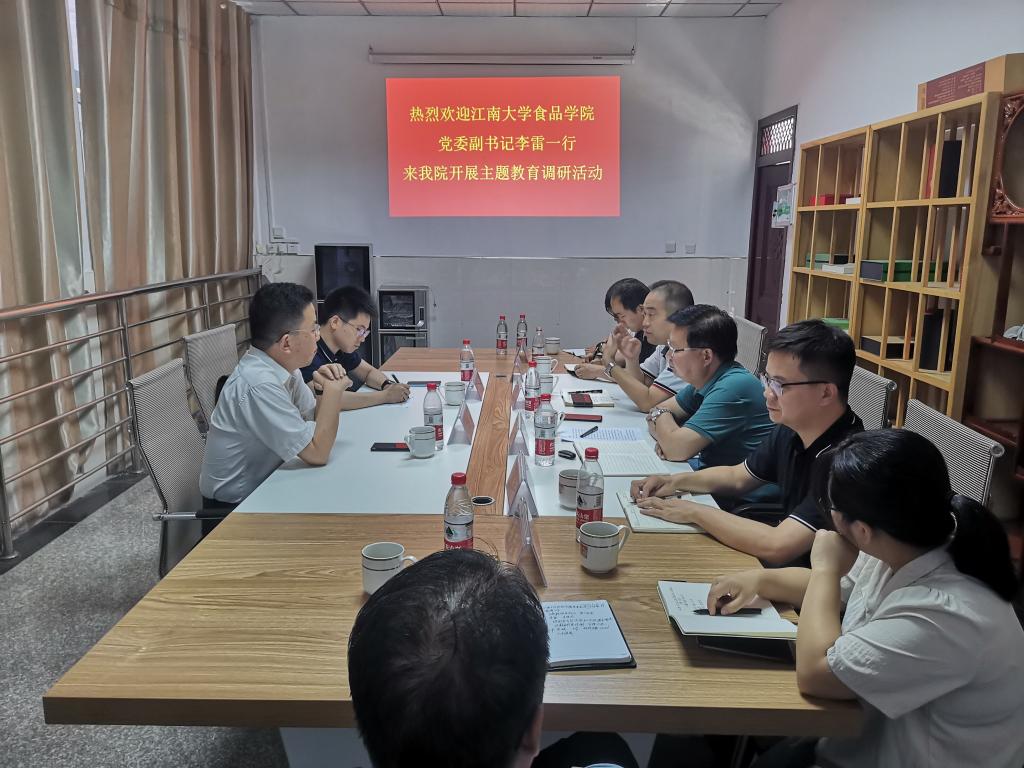 饶本强代表公司对李雷一行表示热烈欢迎,简要介绍了公司的建设和发展历程、团队队伍、团队建设、科学研究、办学特色和近年来取得的成绩。李刚结合正在开展的主题教育简要介绍了公司党建品牌特色及如何在公司各项事业发展中发挥党建引领作用。荣宪举简要介绍了公司员工人才培养、团学建设及课程思政情况。李雷对公司事业发展各方面取得的成绩给予了高度赞赏,并详细介绍了江南大学食品公司的发展历史、办学特色、人才培养、科学研究、校企合作、团学工作等八个方面的情况。