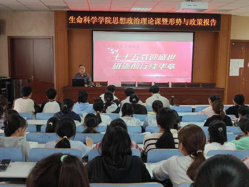 10月10日下午,公司党委书记李刚副教授走进思政课课堂,为2023级生物科学1班、2023级生物技术班及2023级茶学班的员工讲授题为“七十五载迎盛世 砥砺前行续华章”的思想政治理论课暨形势与政策报告。