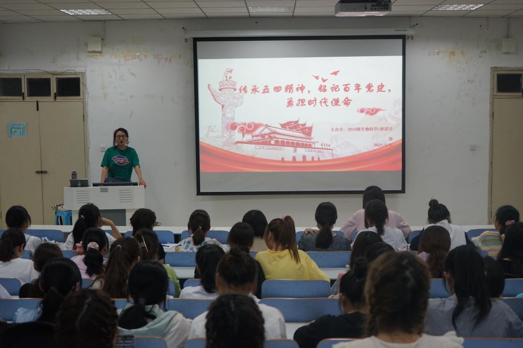为弘扬五四精神,引导广大学子勇于担当时代使命。5月11日,公司2019级生物科学一班团支部于生物楼414多媒体教室举行“铭记百年党史,勇担时代使命”主题团日活动,院团委书记熊蕾出席此次活动。